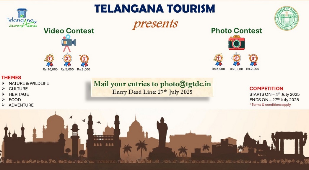 The Telangana Tourism Photo and Video Contest aims to promote the state’s cultural richness, natural beauty, and modern tourism attractions through high-quality visuals submitted by participants. This contest is open to all amateur and professional photographers/videographers. No entry fee is required. Themes of contest are Nature, Wildlife, Culture, Heritage, Food and Adventure., Maximum 4 photos and 2 videos per participant per theme. Last date of contest is 27th July 2025.
