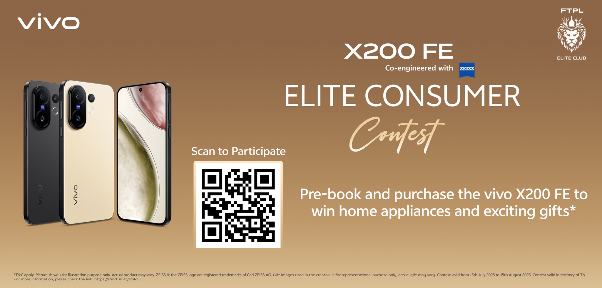 Elite Consumer Contest 2025 is organised by Fangs Technology Pvt. Ltd. The Participant should be an Indian citizen residing in Tamil Nadu and should be above the age of 18 years eligible in this Contest. To be eligible to participate in the Contest, Participant must pre – book and purchase the vivo X200FE between the Contest Period. Lucky Winners will stand a chance to various Home Appliance. Last date of contest is 15th August 2025.