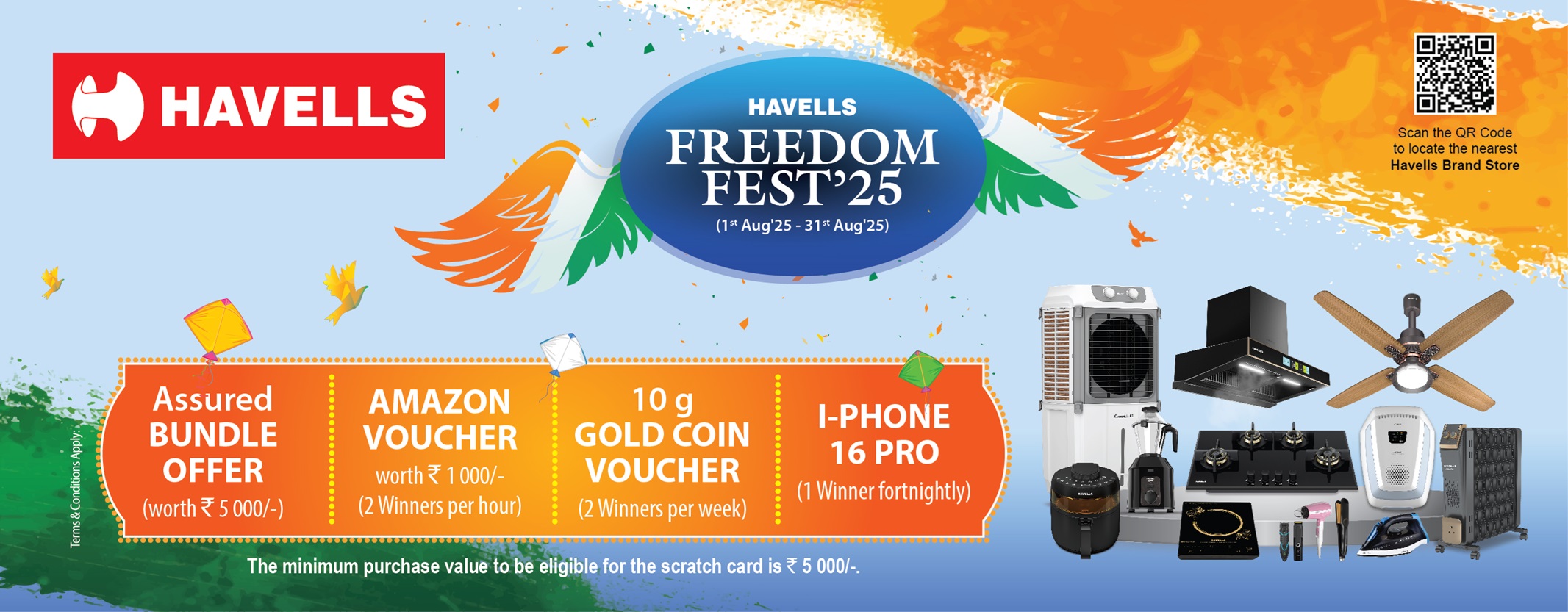 Havells Freedom Fest (Saving Consumer Promotion Offer) 2025 is launched by Havells India Limited, conducted by Pine Labs Limited. The Program is valid only in India except in Tamil Nadu and Kerala. The Program is open to Citizens of India only. Havells Freedom Saving Consumer Promotion offer is valid for a limited period from 1st August 2025 to 31st August 2025 This Program is applicable on following product categories Small Domestic Appliances, Havells Fans, Air Coolers, Havells Water Heaters, Water Purifier, Personal Grooming, Chimneys & Hobs. Offer applicable only till gift stock lasts.