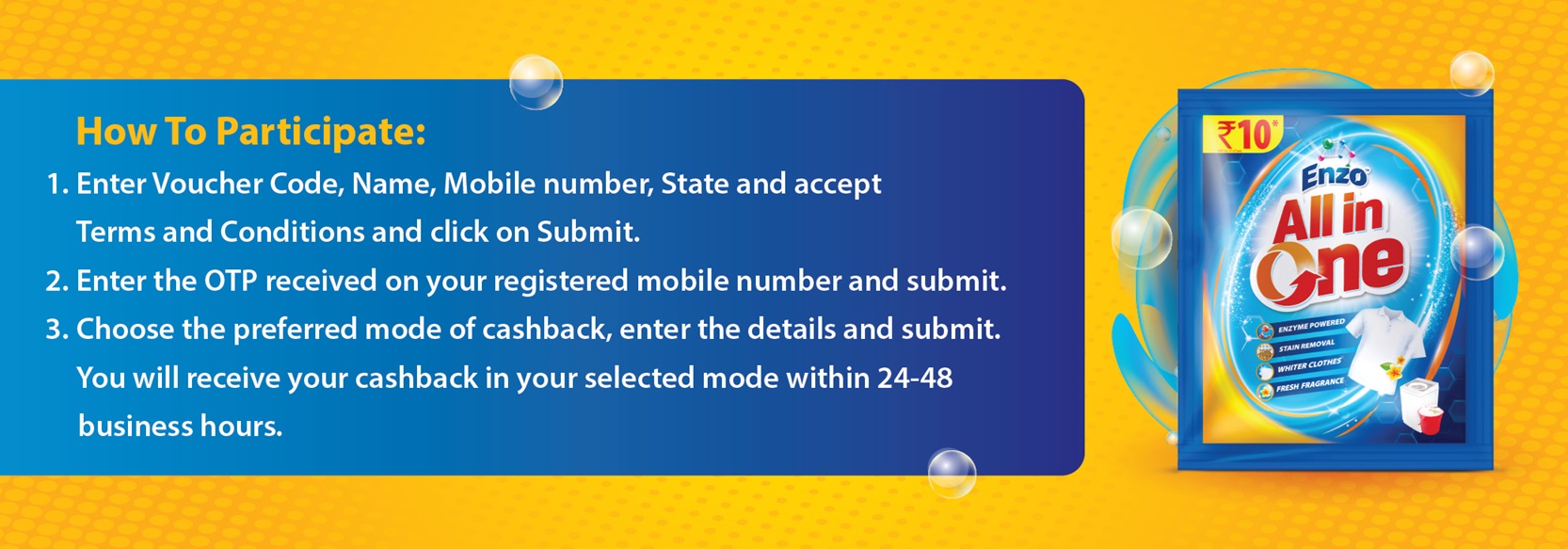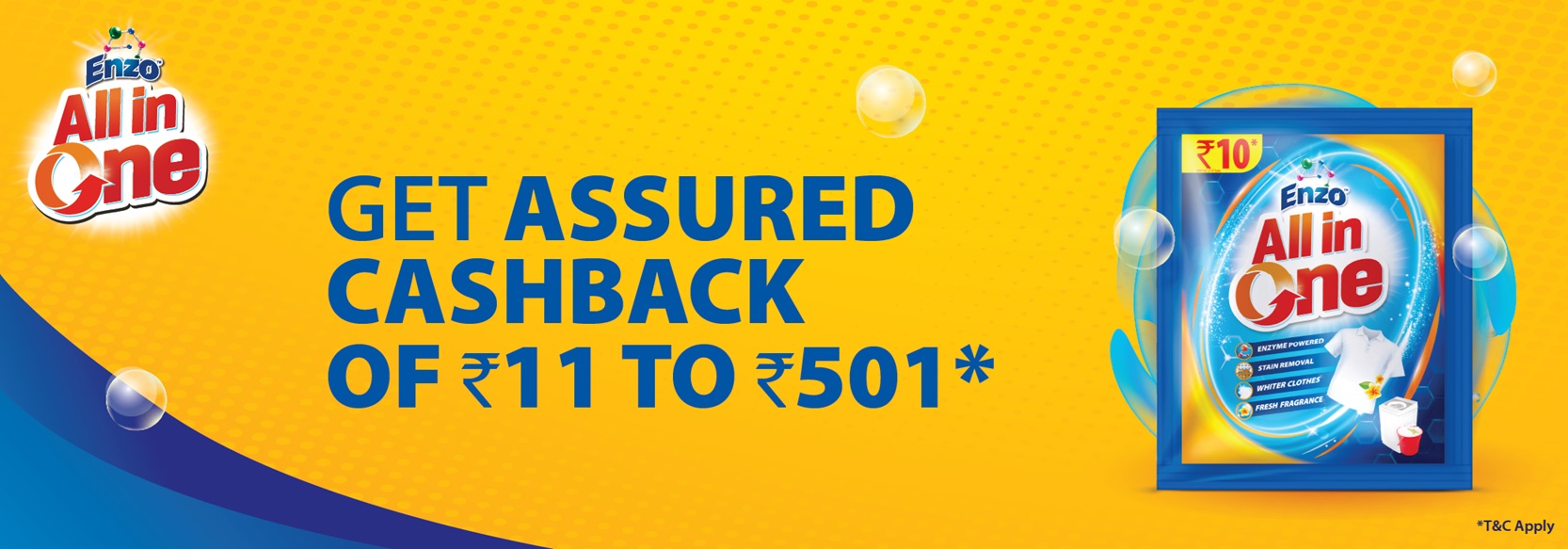 1. For the Participants who are residents of Tamil Nadu: All the Participants in the state of Tamil Nadu shall be eligible to receive a flat cashback reward of ₹ 11 (Rupees Eleven) only on SKU 90gram of Enzo All in One detergent through the process provided above in clause 4.