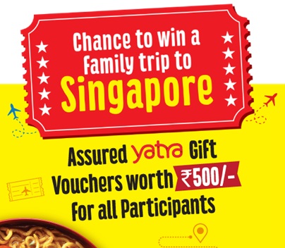 The Nestle Maggi Consumer Promotion Competition 2025 is launched by Nestlé India Limited. This Program is valid in India. Participants must be citizens of India and must reside in India. This competition is only valid on MAGGI® 2 Minutes Noodles 70g and 48g packs. Participate and win Yatra Voucher worth Rs. 500 & Singapore Family Trip Voucher. Last date of competition is 15th October 2025.