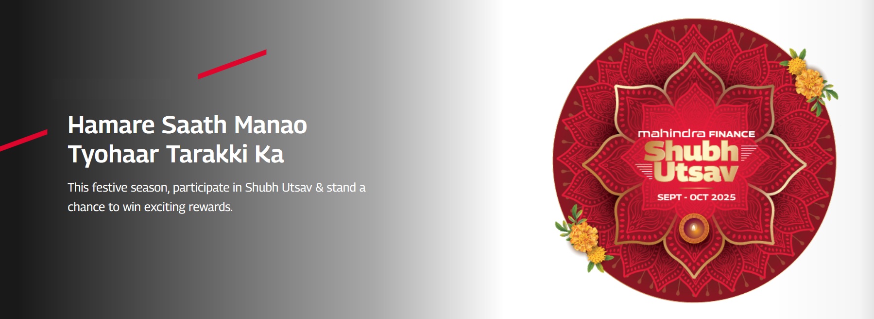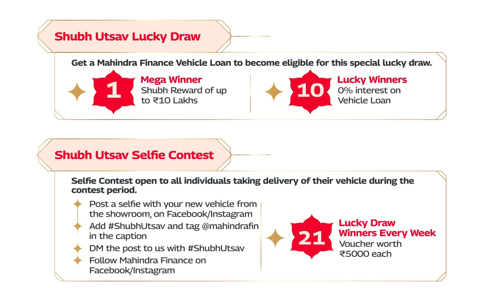Shubh Utsav Festive Campaign consisting of Shubh Utsav Lucky Draw and the Shubh Utsav Selfie Contest is organized by Mahindra & Mahindra Financial Services Limited. All customers who have taken a vehicle loan from Mahindra Finance, for purchasing a new passenger vehicle, or for purchasing a new vehicle from the Mahindra Pik-Up Segment during the Offer Period will automatically qualify. Participate and win Shubh Reward up to ₹10 Lakhs & Voucher worth Rs. 5000. Last date of contest is 31st October 2025.