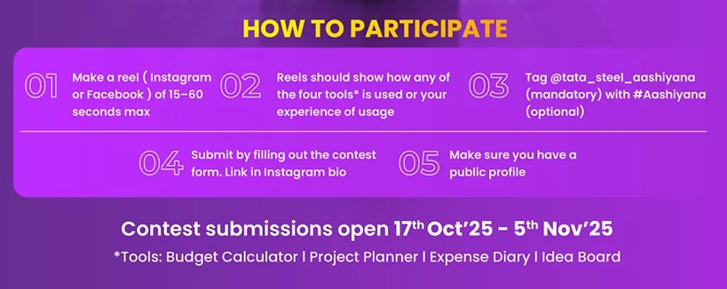1. Any individual who meets the eligibility criteria may participate in this Contest by posting a short video on their personal Instagram and/or Facebook feed/timeline following tools available on https://aashiyana.tatasteel.com/.