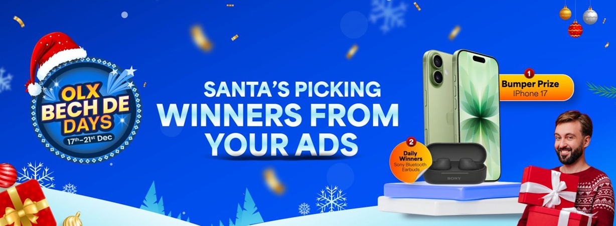 OLX Bech De Christmas Contest 2025 is organised by Sobek Auto India Private Limited (OLX India). Eligible participants must be a subscribed user of OLX. To participate, you must make a listing on the OLX platform during the contest period (17th December 2025 to 21st December 2025). Receive and complete the quiz sent via push notification or WhatsApp after the daily window closes. Participate and win Sony Earbuds & iPhone 17 (256 GB). Last date of contest is 21st December 2025.
