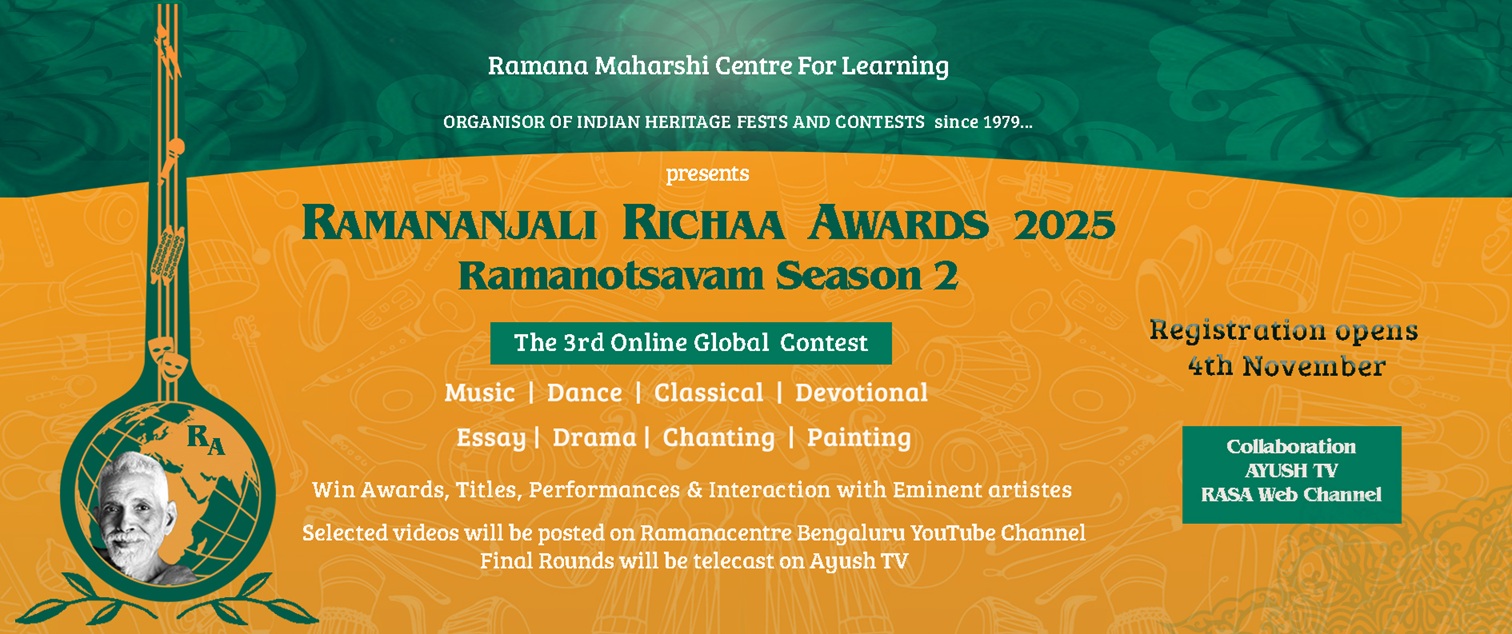 Ramananjali RICHAA Contest is celebrating 45+ years of Ramana Maharshi Centre for Learning, its Cultural Archives and its service in spreading awareness about the Indian Cultural Heritage. This celebration is happening through the RICHAA Project – Ramana Indian Cultural Heritage Archives and Awareness. The Archives consist of Ramananjali, which is a vast body of music encompassing many streams and styles of the music of India, classical and devotional dance, theatre and literature on the life and teachings of Ramana Maharshi. Last date of registration is 20th January 2026.