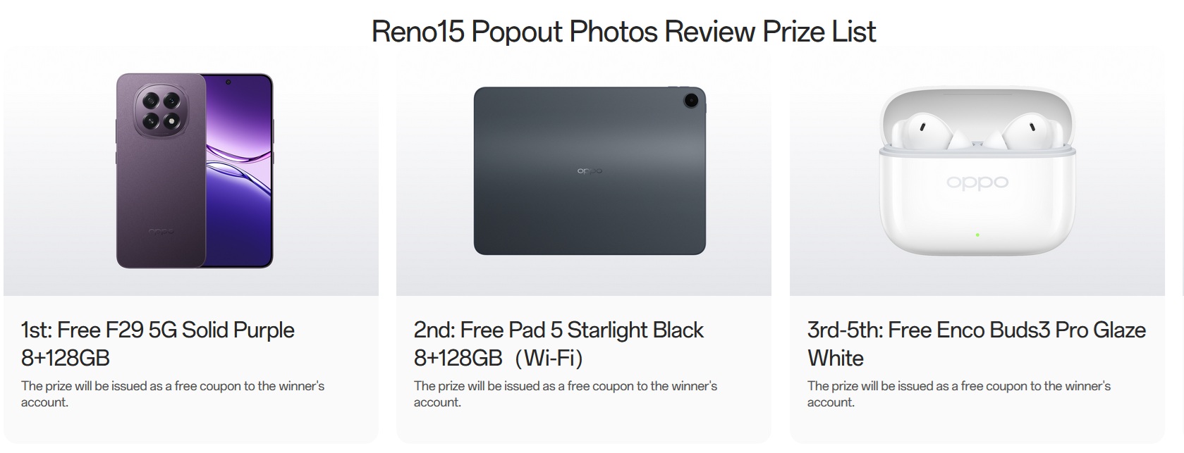 Prizes of OPPO Review Reno15 Series Rewards Campaign
