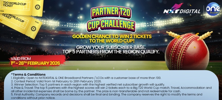 The NXTDIGITAL & ONE Broadband Partner T20 Cup Challenge is a limited-period incentive program designed to reward eligible NXTDIGITAL and ONE Broadband partners based on performance during the contest period. The Contest is only open to all NXTDIGITAL and ONE Broadband partners with an active subscriber base exceeding 100 as on the contest start date. Each winning partner will receive 2 tickets to a Big T20 World Cup Match scheduled in early March 2026. Last date of contest is 28th February 2026.