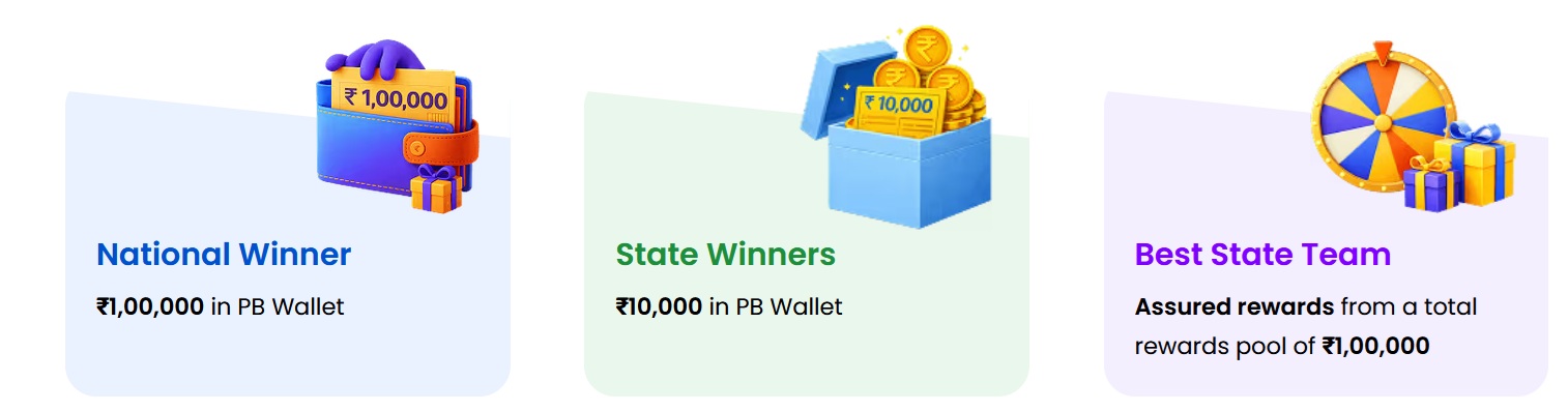 The National Winner with the highest credit score will get Rs. 1 Lakh in PB wallet. Users with the highest score in each state will get Rs. 10,000 in PB Wallet. Participants from the state with the highest average credit score will get assured rewards from a total rewards pool.