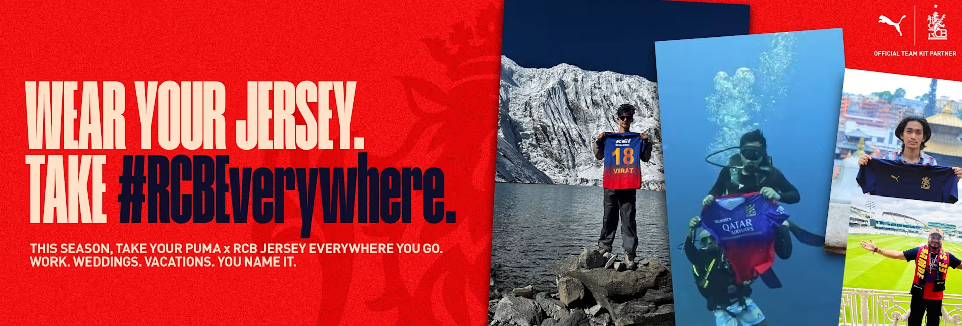 The #RCBEverywhere Campaign is a User-Generated Content (UGC) initiative organised by PUMA India in association with Royal Challengers Bengaluru (RCB). The campaign celebrates the cultural phenomenon of RCB fans taking the new 2026 PUMA x RCB jersey to unexpected, extraordinary, and memorable locations across the world, and sharing those moments on Instagram. The campaign operates on a simple premise: Real Fans. Real Places. Real Effort. PUMA does not invent fan behaviour — it amplifies and rewards it. Entries powered by artificial intelligence of any kind will be treated as a separate AI Entry category with its own reward structure.