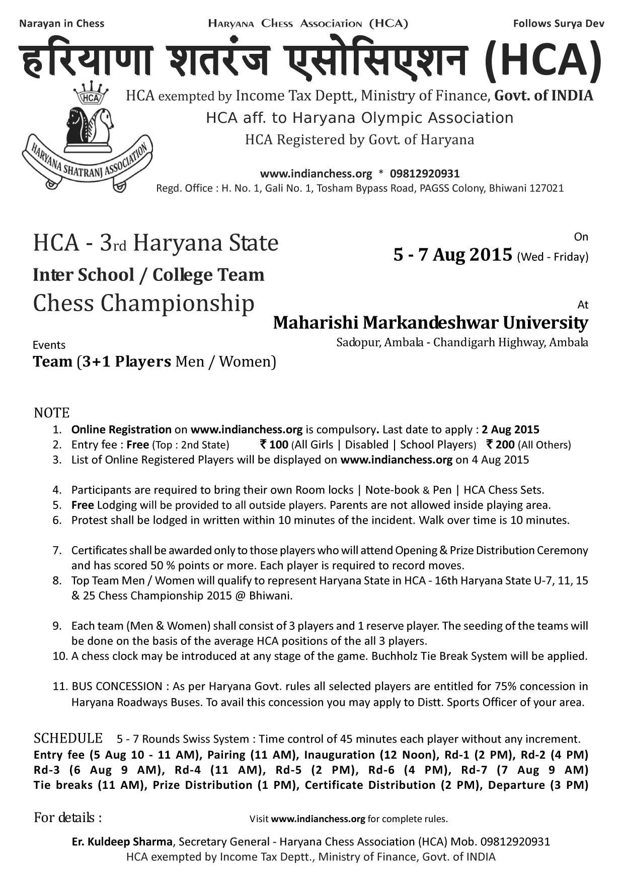 ** Top Team Men/Women will qualify to represent Haryana State in HCA-16th Haryana State U-7, 11, 15 & 25 Chess Championship 2015 (G) Bhiwani.