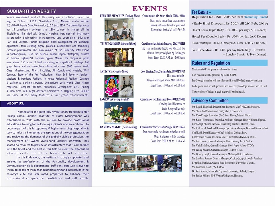 ** It also trains them to face the real situational based challenges and enhances the skills that they need to succeed in long run. The Key events of competition are- Culinary Competition, Bartending Competition, Bakery Competition, Rangoli Competition and Fruit & Vegetable Carving Competition.The Judges of Hospitium will be from renowned hospitality professionals.
